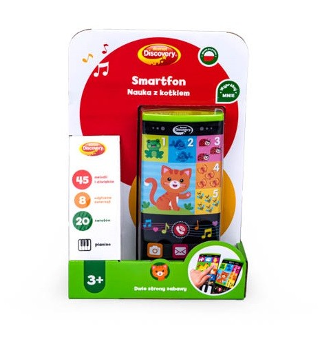 Razem z wesołym kotkiem odkryj 2 strony zabawy. W tym dotykowym smartfoniku kryje się mnóstwo dźwięków, zwrotów w języku polskim, a także nazw zwierzątek oraz cyferek. Sprytny kotek zaprasza wszystkie maluchy do nauki. W smartfoniku pochowały się kolorowe zwierzątka, cyferki i instrumenty muzyczne, a nawet pianinko. To aż dwie strony zabawy. Realistyczne odgłosy, wesołe melodie i zwroty w języku polskim z pewnością zainteresują szkraba, zapewniając mu zajęcie na długi czas.