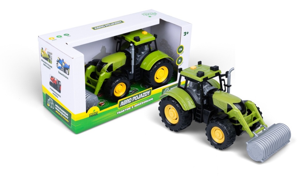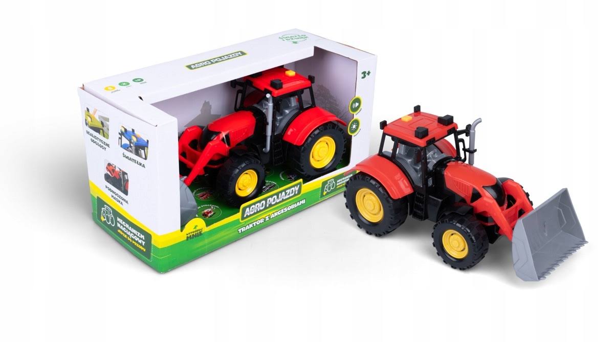 Odkryj serię Agro Pojazdy wciel się w rolę operatora maszyn rolniczych. Traktor do złudzenia przypomina pełnowymiarowy pojazd. Posiada on prawdziwe światełka, podnoszoną maskę i przyciski na dachu, które uruchamiają realistyczne odgłosy. To jeszcze nie koniec niespodzianek. Traktor został wyposażony w mechanizm naciągowy, dzięki któremu pojazd jeździ do przodu.