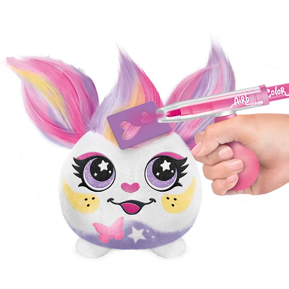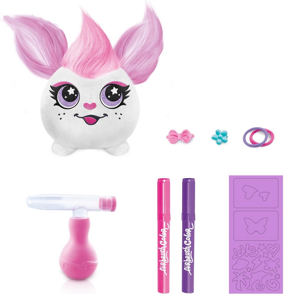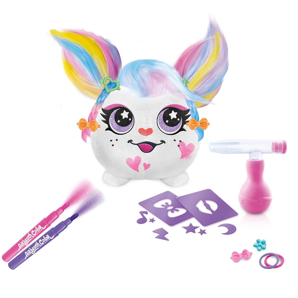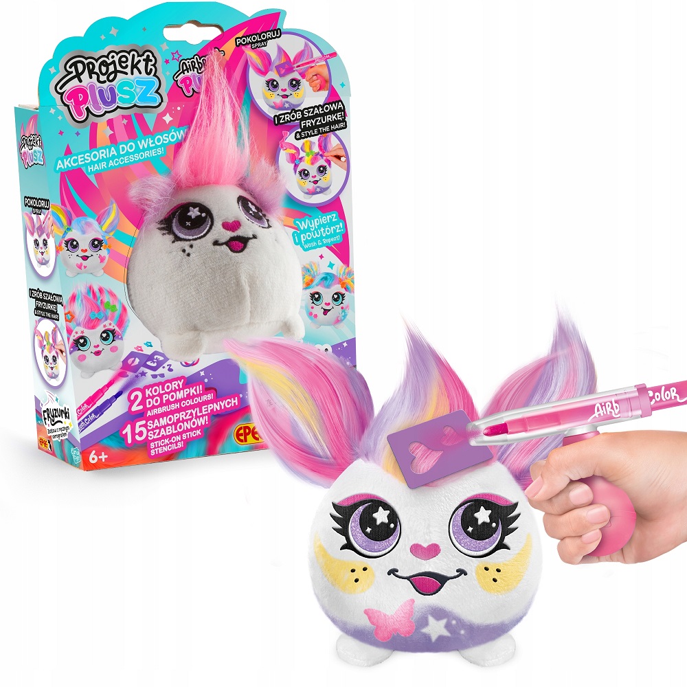 Kreatywny Pluszak Plusz „Różyczka” z Aerografem. Ozdób swojego pluszaka kolorowymi wzorami za pomocą pompki aerografu! Użyj szablonów i markerów, aby stworzyć wyjątkowy, niepowtarzalny styl. Udekoruj swojego pluszaka za pomocą pompki aerografu. To proste! Przyklej szablon i użyj sprayu, aby stworzyć fantastyczne wzory. Możesz nawet pokolorować mu włosy i stworzyć z nich szałową fryzurkę! A po zabawie, po prostu go wypierz i zacznij od nowa.