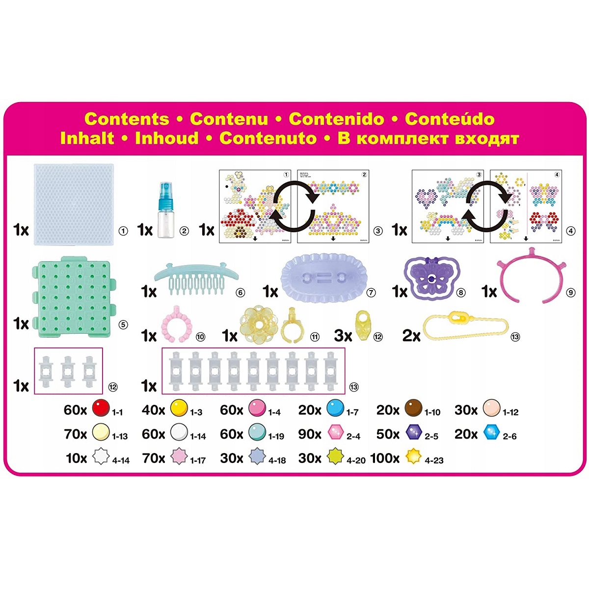 Magiczny bajkowy świat Aquabeads. Stwórz bajkowe kreacje z niesamowitych koralików Aquabeads – ułóż wróżkę, jednorożca, tęczę i wiele innych. Stosując zawarte w zestawie elementy do tworzenia biżuterii wykonasz także piękne pierścionki, spinki do włosów, bransoletkę lub broszkę. Po wyschnięciu koralikowe obrazki można przymocować do nowej tablicy dekoracyjnej i stworzyć wspaniałą ozdobę do pokoju dziecięcego. Zestaw zawiera też zawieszki, za pomocą których wykonane figurki można przyczepić do torebki lub kluczy. Wspaniały zestaw dla kreatywnych bajkowych księżniczek: Aquabeads łączą się ze sobą w magiczny sposób, wystarczy tylko spryskać je wodą. Bez prasowania czy klejenia.
