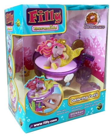 Morska Kawiarenka zabierze Filly Mermaids na szaloną zabawę. Teraz Twoja Syrenka może potańczyć na obracanym podeście do tańca, a potem odpocząć w pięknym foteliku w kształcie muszelki.