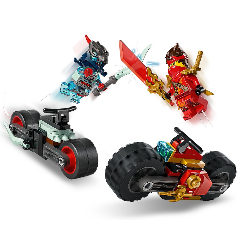 Zestaw Lego Ninjago 71838 Wyścig motocyklowy Kaia umożliwia chłopcom i dziewczynkom w wieku od sześciu lat odtwarzanie scen z trzeciego sezonu serialu Ninjago Powstanie Smoków. Ten pełen akcji zestaw do zabawy w pościgi zawiera dwa motocykle ninja z ruchomymi kołami: motocykl wyścigowy Kaia ozdobiony dwoma sztyletami i demoniczny motocykl złego zwiadowcy Spektralnych Dragonów. Zestaw oprócz pojazdów obejmuje dwie minifigurki Ninjago: Kaia uzbrojonego w przezroczyste ostrze ujawnienia i dwie złote katany oraz zwiadowcę Spektralnych Dragonów z mieczem. Dzięki temu dzieci mogą świetnie bawić się samodzielnie lub z przyjaciółmi, odgrywając walkę dobra ze złem.