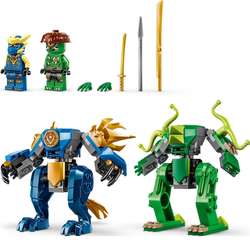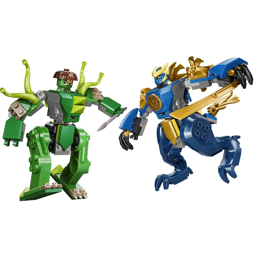 Klocki Lego Ninjago 71853 Bitwa w smoczym mechu Jaya . Dzięki temu fajnemu mechowi chłopcy i dziewczynki w wieku od czterech lat mogą nauczyć się budować i odgrywać sceny bitewne z czwartego sezonu serialu Ninjago: Powstanie Smoków. Zestaw Lego Ninjago zawiera dwa mechy i dwie minifigurki. Smoczy mech Jaya ma otwierany kokpit dla minifigurki oraz ruchomy ogon, skrzydła, ramiona, nogi, tułów i palce, natomiast mech bojowy zmutowanego potwora ma otwierany kokpit dla minifigurki oraz ruchome macki, ramiona, nogi itułów. Zestaw zawiera również cztery wymienne bronie, które poszerzają możliwości zabawy: dwa miecze, włócznię i pazury. Ta zabawka została stworzona, aby zapewnić zabawę dzieciom w wieku od czterech lat, które odkrywają radość z budowania z klocków Lego. Zestaw zawiera klocek startowy – częściowo zbudowaną podstawę, która pozwala maluchom szybko i pewnie rozpocząć budowanie.