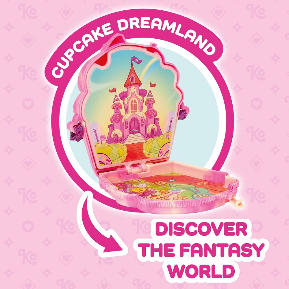 Cupcake Dreams zawiera różową torebkę w kształcie babeczki ozdobioną serduszkami.