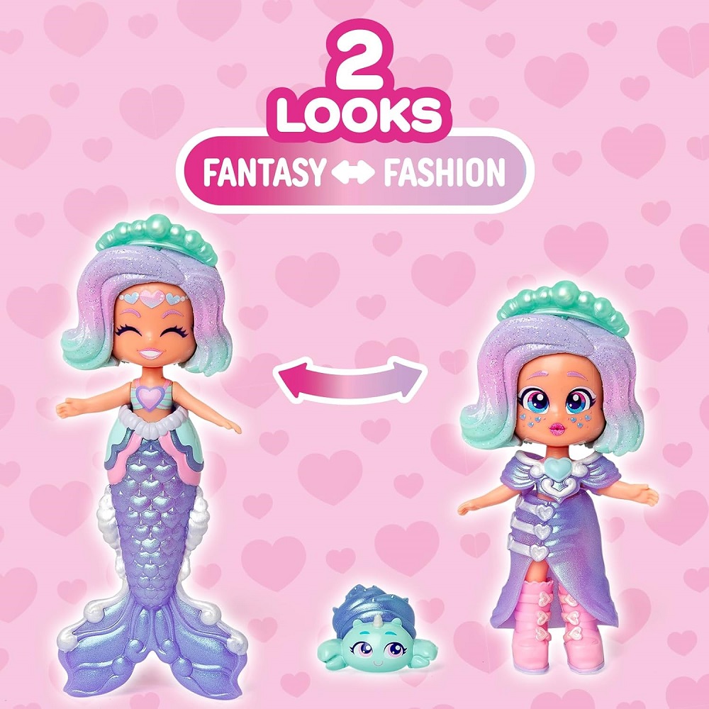 Zanurz się w magicznym podwodnym świecie zamieszkanym przez syrenki Kookyloos Mermaids! Dwie lśniące mieszkanki morskich głębin, Starlight Fantasy i Sunset Dream, wynurzyły się, by oczarować świat swoim oceanicznym stylem i bajecznym blaskiem. Każda syrenka Kookyloos Mermaid znajduje się w wyjątkowej torebce w kształcie muszli. Dzięki temu możesz ją zabrać ze sobą wszędzie i cieszyć się stylową zabawą! W środku czeka na Ciebie masa niespodzianek: urocze akcesoria związane z morzem, unikatowe morskie zwierzątko i dwa oblicza w jednym – wersja z ogonem syrenki do wodnych przygód, a po odpięciu ogona modna stylizacja do zabawy lądzie!