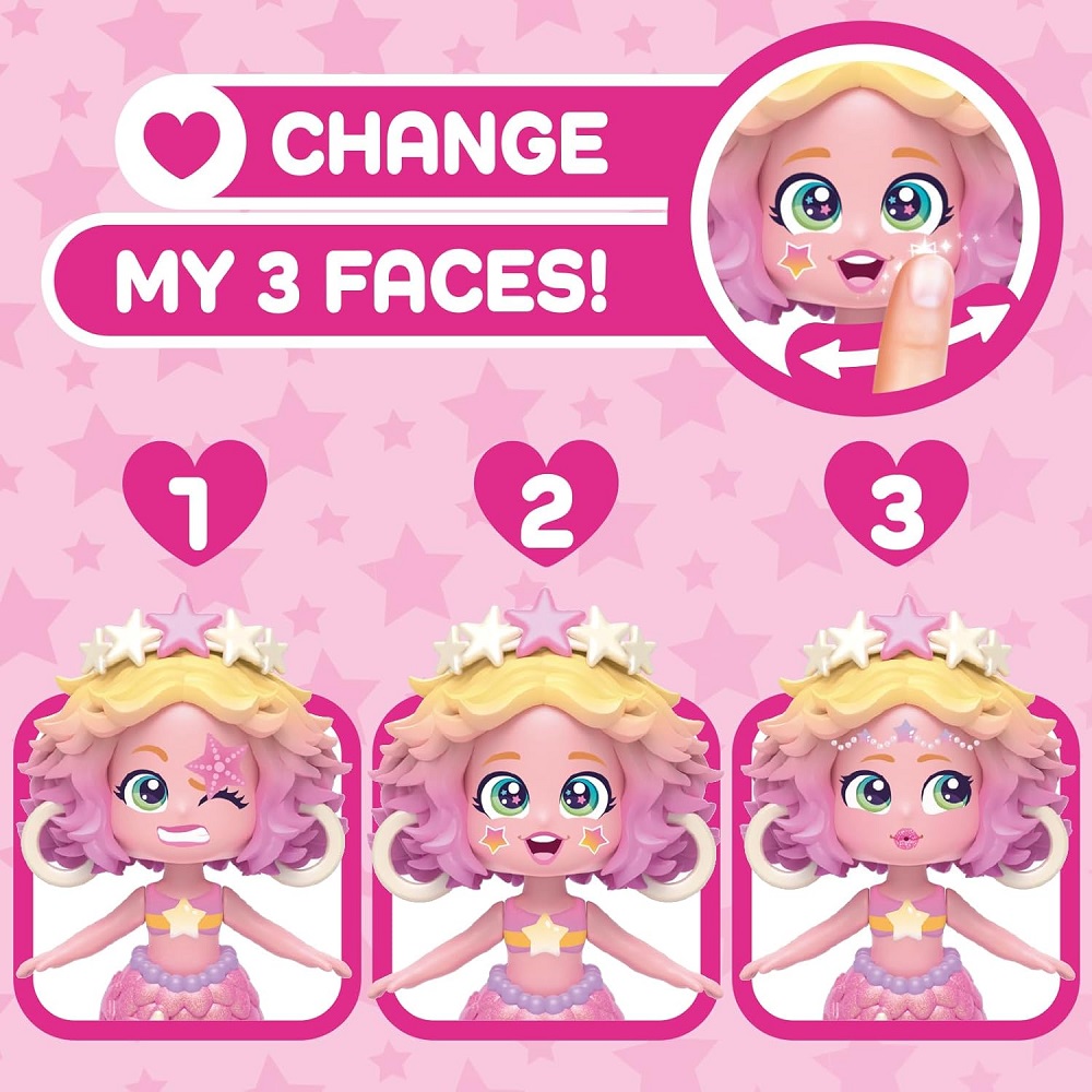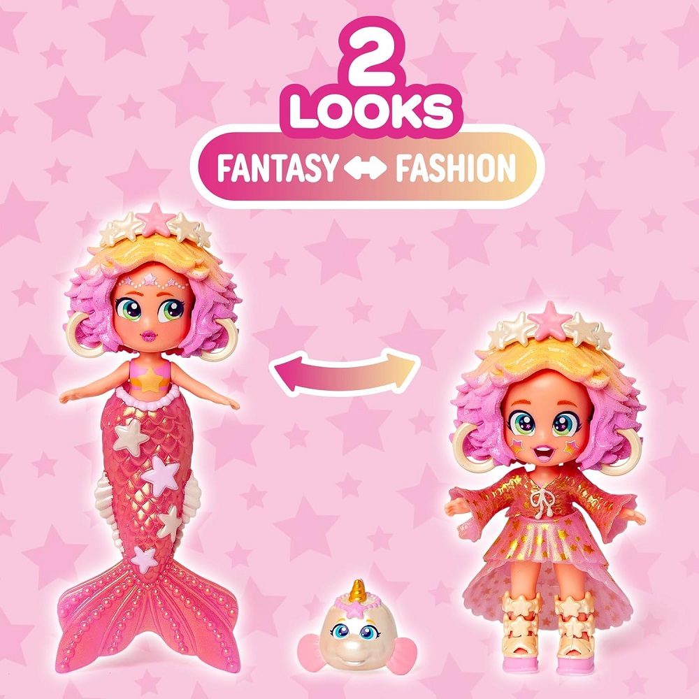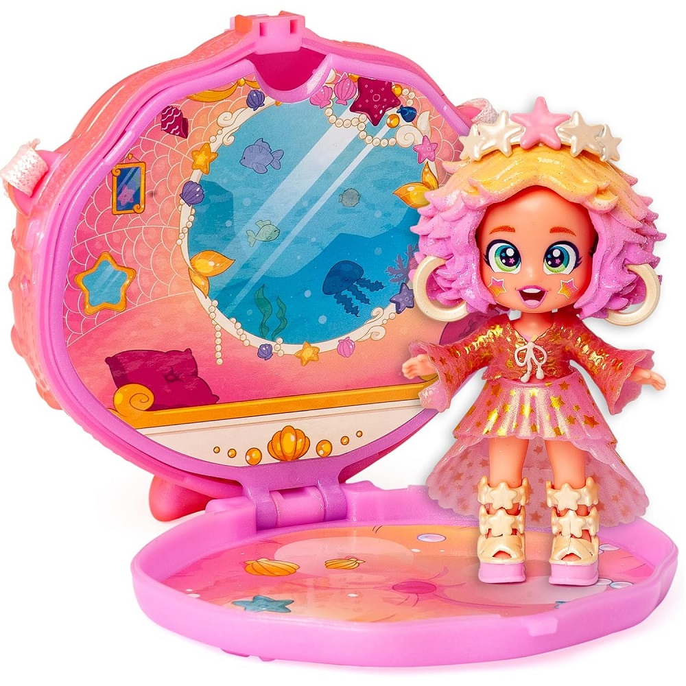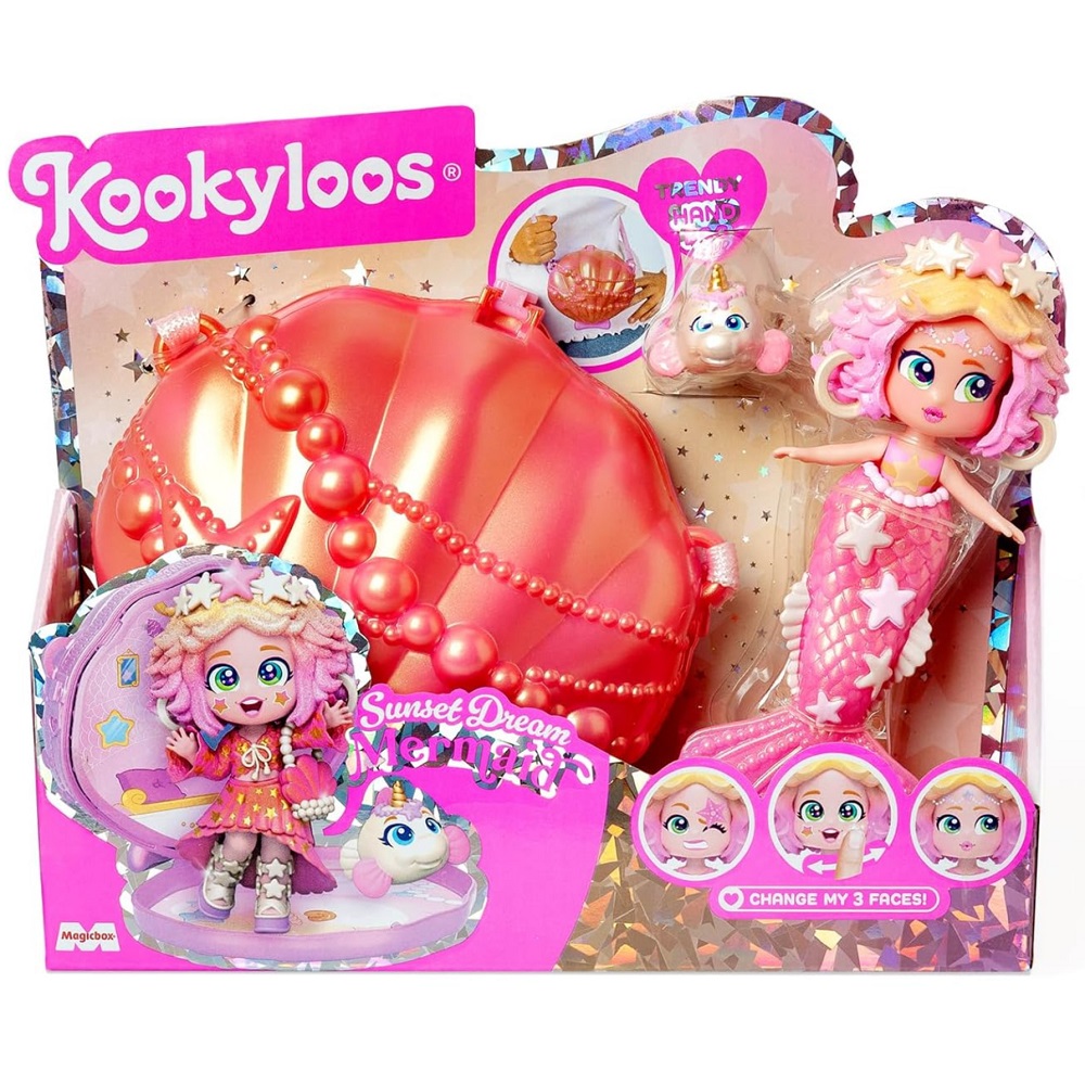 Zanurz się w magicznym podwodnym świecie zamieszkanym przez syrenki Kookyloos Mermaids! Dwie lśniące mieszkanki morskich głębin, Starlight Fantasy i Sunset Dream, wynurzyły się, by oczarować świat swoim oceanicznym stylem i bajecznym blaskiem. Każda syrenka Kookyloos Mermaid znajduje się w wyjątkowej torebce w kształcie muszli. Dzięki temu możesz ją zabrać ze sobą wszędzie i cieszyć się stylową zabawą! W środku czeka na Ciebie masa niespodzianek: urocze akcesoria związane z morzem, unikatowe morskie zwierzątko i dwa oblicza w jednym – wersja z ogonem syrenki do wodnych przygód, a po odpięciu ogona modna stylizacja do zabawy lądzie!