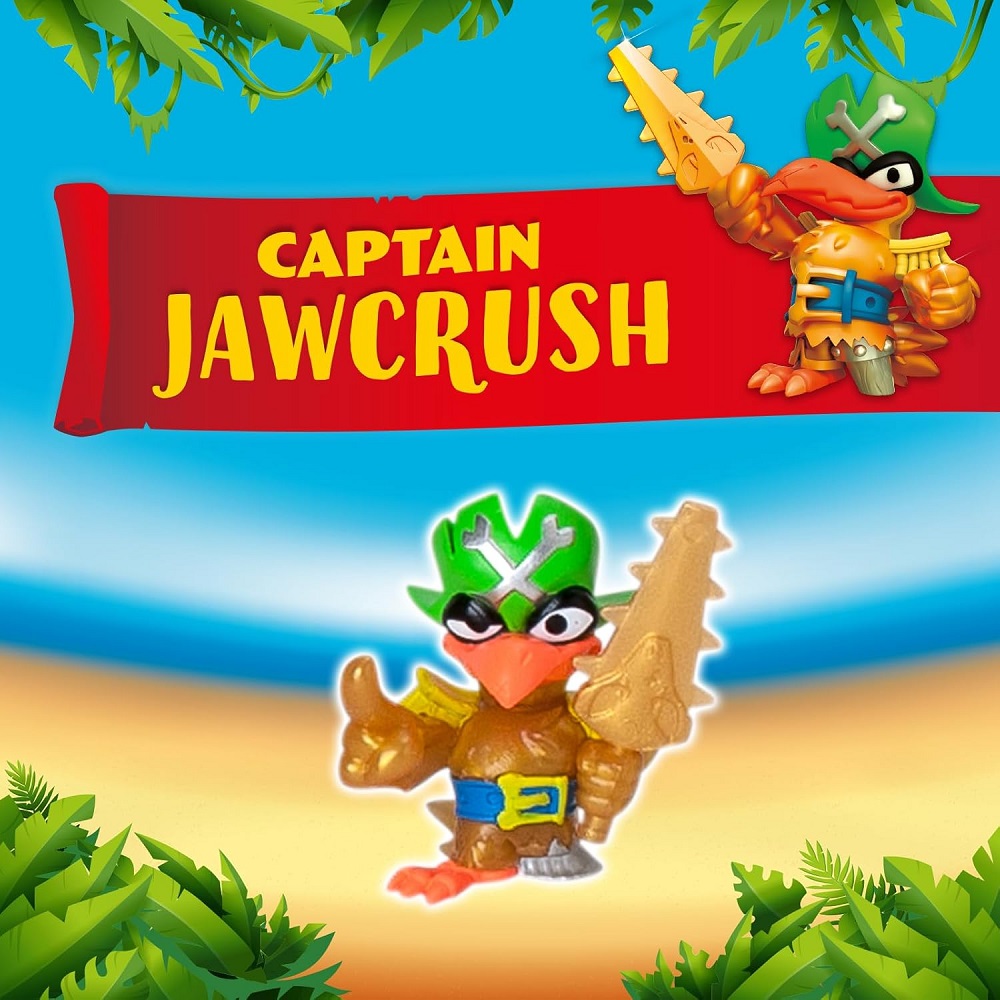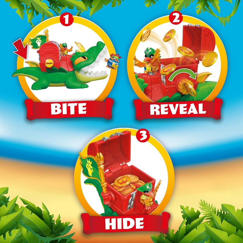 Najbardziej przerażające szczęki na Jungle Island należą do King Croca i jego chciwego kapitana Jawcrusha. King Shark może i jest władcą wód, ale na lądzie król jest tylko jeden – i jest nim ten przerażający krokodyl o niezwykle silnych szczękach. Legenda głosi, że King Croc i kapitan Jawcrush znaleźli w głębi Jungle Island starożytną skrzynię pełną skarbów, a wśród nich specjalny magiczny dublon, który nadał gadowi niezrównaną siłę zgryzu. Teraz obaj wędrują wśród bujnej roślinności wyspy, nieustannie poszukując kolejnych skarbów. Jeśli natkniesz się na nich, lepiej miej przy sobie coś wartościowego: są bardzo chciwi i zawsze pragną umieścić jeszcze więcej skarbów we wnętrzu swojej wspaniałej skrzyni. King Croc otwiera swoją ogromną paszczę, aby połknąć każdego, kto stanie mu na drodze. Użyj ekskluzywnej monety, aby otworzyć skrzynię i schować swoje łupy. Dołącz do kapitana Jawcrusha, aby zostać królem dżungli!