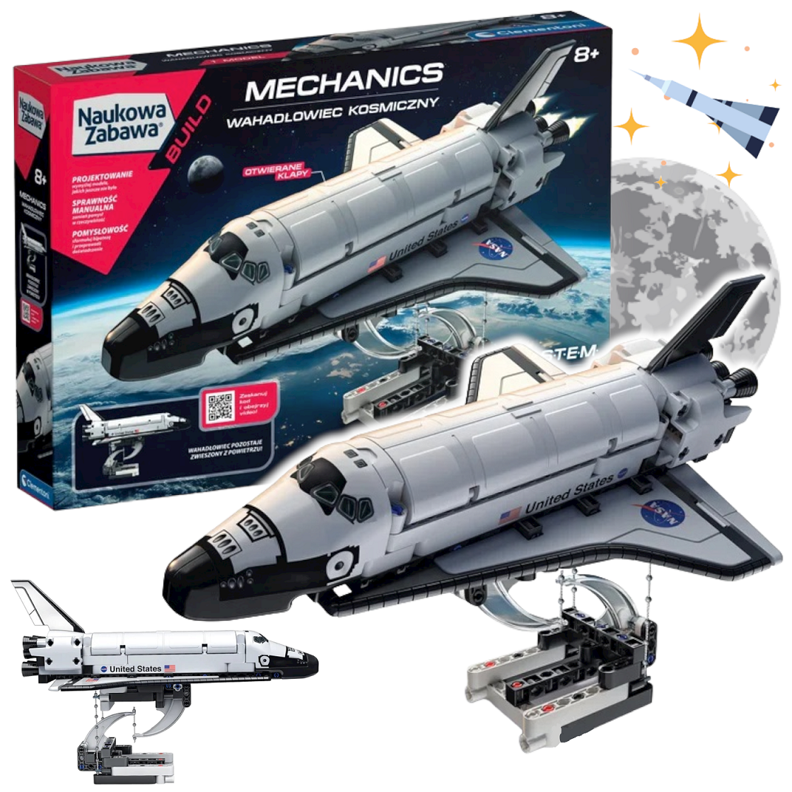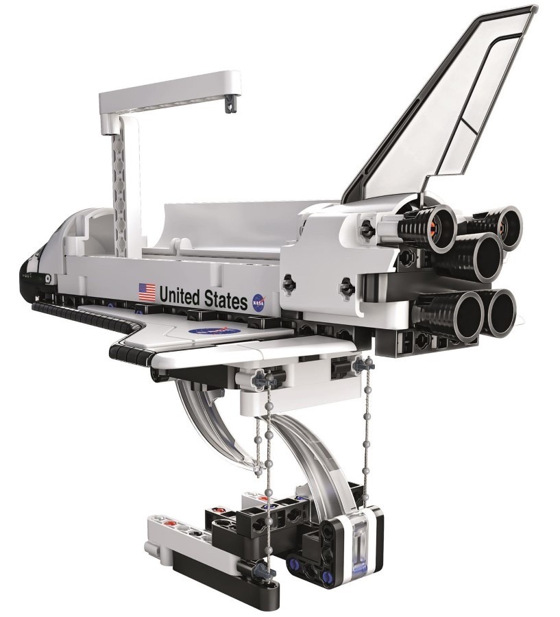 Kosmos jeszcze nigdy nie był tak niesamowity! Wahadłowiec, w którym możesz wyruszyć na wspaniałe przygody niczym prawdziwy astronauta! Wahadłowiec jest dostarczany w częściach, które należy złożyć. Dzięki efektowi tensegrity zdaje się unosić w powietrzu! Postępując zgodnie z instrukcją montażu, papierową bądź w aplikacji, dziecko odkrywa, co kryje się za złudzeniem optycznym: tensegrity, prawo fizyczne warte bliższego poznania. Wahadłowiec doczepia się do podstawy, umożliwiając swobodną zabawę. Klapy unoszą się i opuszczają, luk ładunkowy otwiera się, odsłaniając Canadarm – robotyczne ramię używane przez kosmonautów! Zaskakująca zabawa, która przybliża dziecku świat mechaniki i inżynierii.