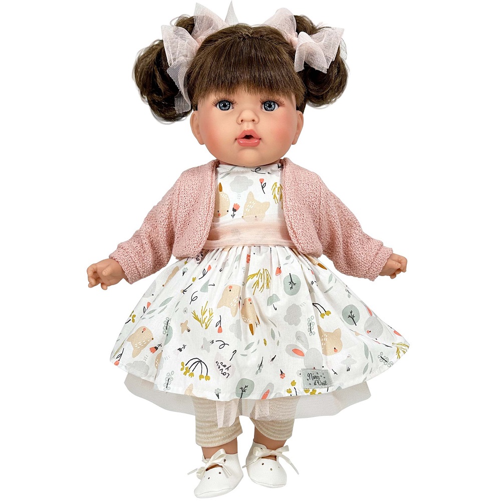 Lalka hiszpańska Tita to brunetka ubrana w piękną sukienkę oraz sweterek. Włoski lalki upięte są w kucyki, przyozdobione kokardkami. Posiada ona wiązane buciki. Nie ma większej radości niż dostać wymarzoną lalkę, która jest jak żywa.