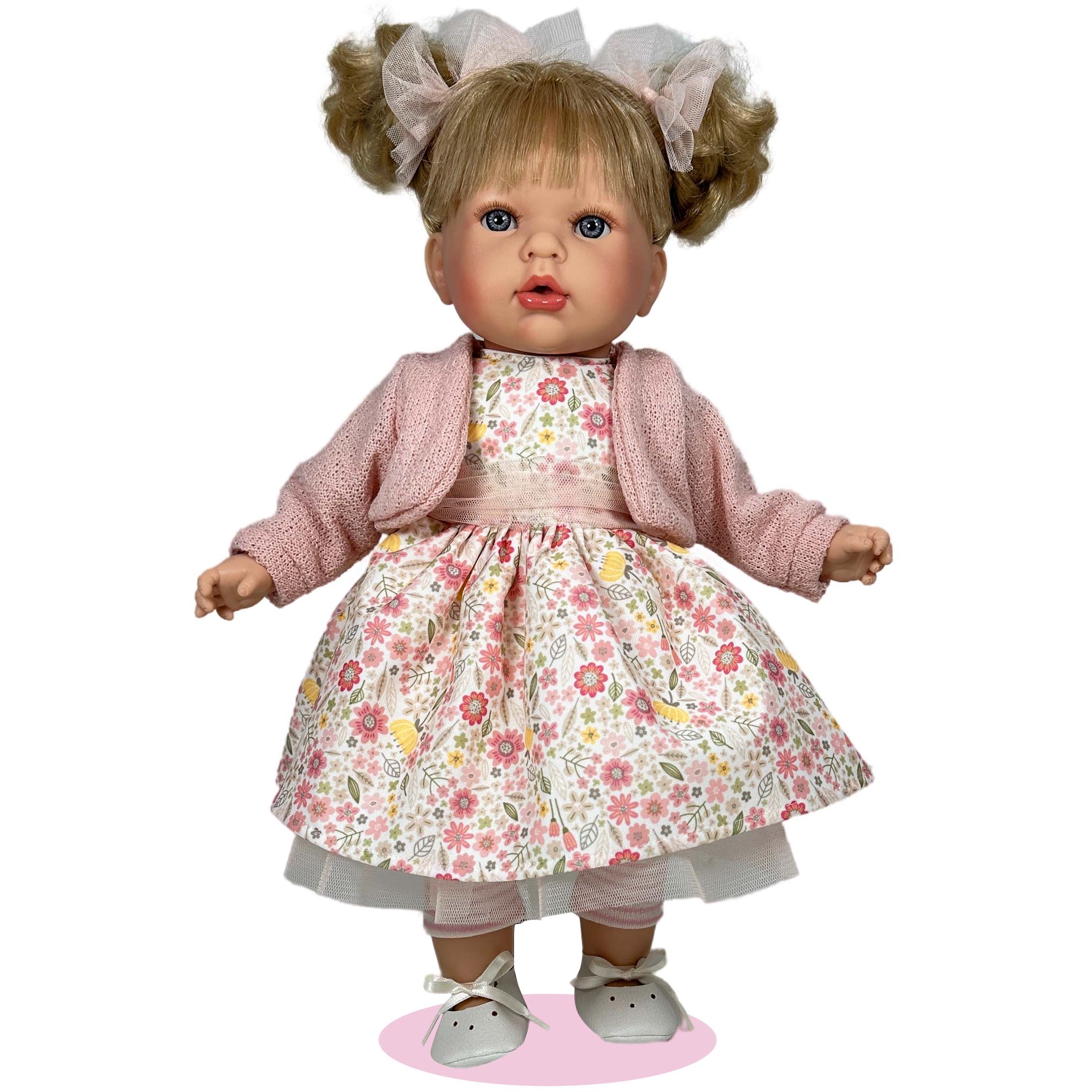 Lalka hiszpańska Tita to blondynka ubrana w piękną sukienkę w kwiaty oraz sweterek. Włoski lalki upięte są w kucyki, przyozdobione kokardkami. Posiada ona wiązane buciki. Nie ma większej radości niż dostać wymarzoną lalkę, która jest jak żywa.