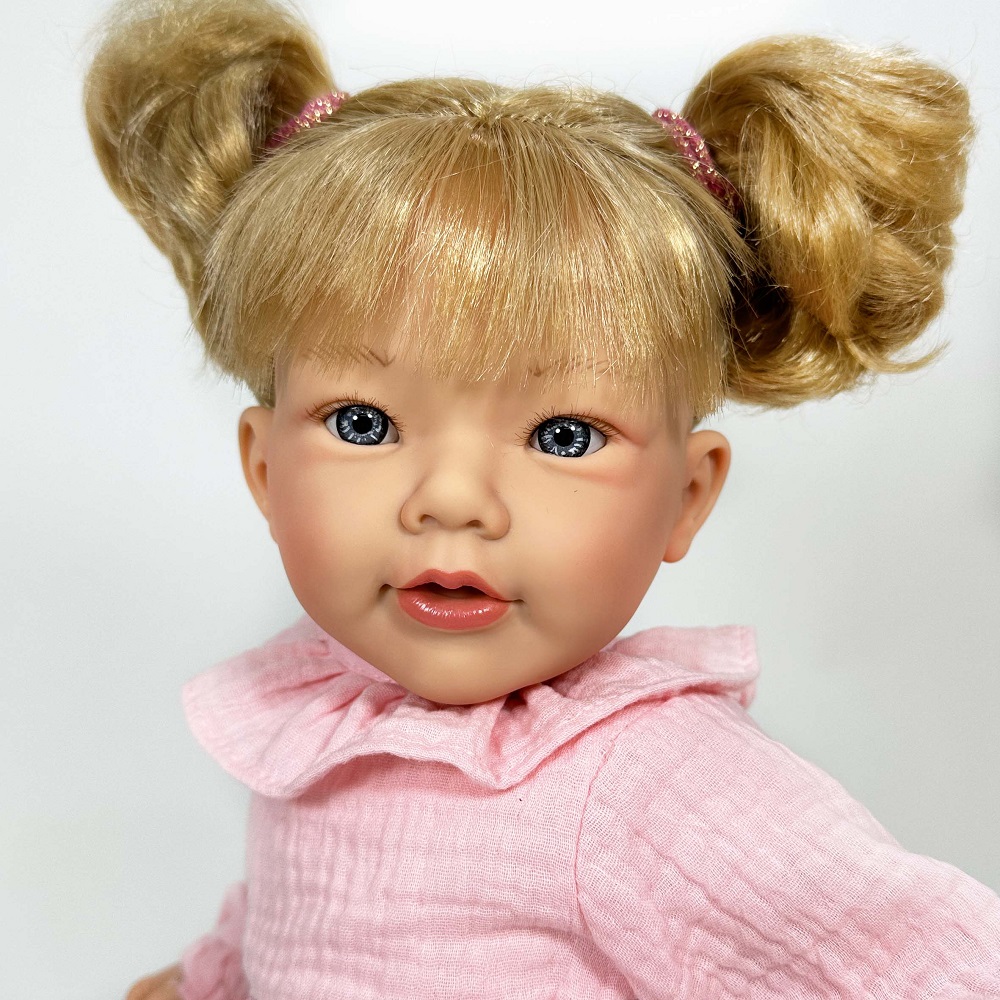 Lalka hiszpańska Chloe to blondynka ubrana w piękną muślinową bluzeczkę, spódniczkę oraz białe rajstopki. Włoski lalki upięte są w 2 kucyki. Lalka posiada również wiązane buciki. Nie ma większej radości niż dostać wymarzoną lalkę, która jest jak żywa.