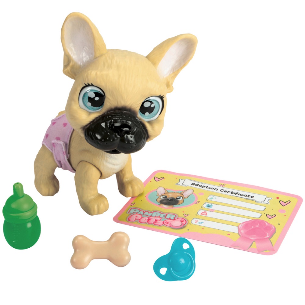 Buldog francuski z kolekcji Pamper Petz potrafi pić prawdziwą wodę z buteleczki i siusiać w swoją pieluszkę, która zmienia kolor, gdy się ją zmoczy. Potrafi także trzymać akcesoria w pyszczku! Zwierzak ma magiczną łapkę, która w magiczny sposób podpowiada czy to chłopczyk czy dziewczynka. Po przetarciu łapki wodą, odbarwia się na kolor niebieski lub różowy, dzięki czemu dzieci poznają płeć swojego szczeniaka. W zestawie oprócz pieska znajdują się trzy niespodzianki do pielęgnacji i karmienia oraz akt adopcji do wypisania przez opiekuna Pamper Petz. Zwierzaka zapakowano w estetyczne papierowe pudełko z rączką, które może posłużyć jako przenośny domek dla pupila.