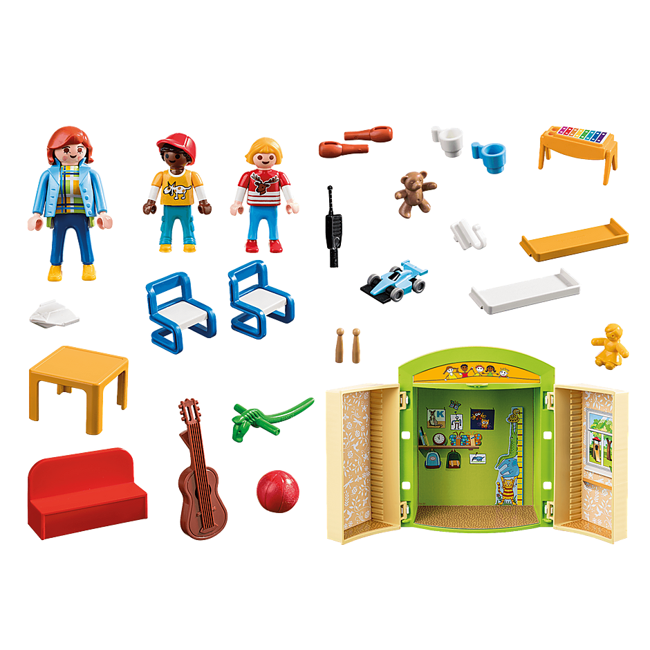 Play Box Przedszkole 70308 to kompaktowy zestaw z nauczycielem i dwójką dzieci. Z mnóstwem zabawek i akcesoriów do symulacji codziennego życia w przedszkolu. Każdego dnia sympatyczna nauczycielka opiekuje się swoimi podopiecznymi. Oprócz dużego programu muzyczno-edukacyjnego jest oczywiście wystarczająco dużo czasu na bieganie i zabawę. Dzisiaj wychodzimy na zewnątrz będziemy grać w koszykówkę i zaczerpniemy świeżego powietrza. Praktyczna walizka Playmobil zawiera prawdziwe małe przedszkole z wieloma pięknymi detalami, takimi jak instrumenty muzyczne, piłka do gry, wygodna kanapa, stół, krzesła i oczywiście figurka nauczyciela i dzieci. Idealny zestaw do zabawy dla wszystkich fanów przedszkola.