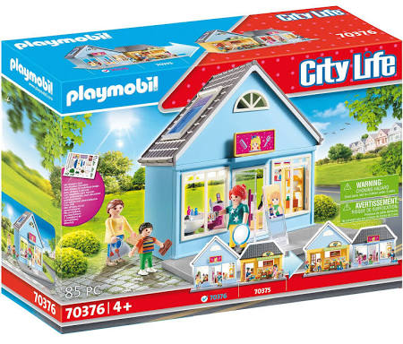 Odwiedź nowo otwarty salon fryzjerski w mieście Playmobil. Przyjazny fryzjer zawsze zna najnowsze trendy fryzjerskie i ma najlepsze porady dotyczące makijażu. Salon fryzjerski wyposażony jest w kilka półek na peruki, doczepiane włosy i kosmetyki do makijażu, a także fotel fryzjerski z ruchomym oparciem, ladę sprzedażową oraz boczną szafkę na kółkach. Salon fryzjerski można połączyć z zestawami z seri City Life.