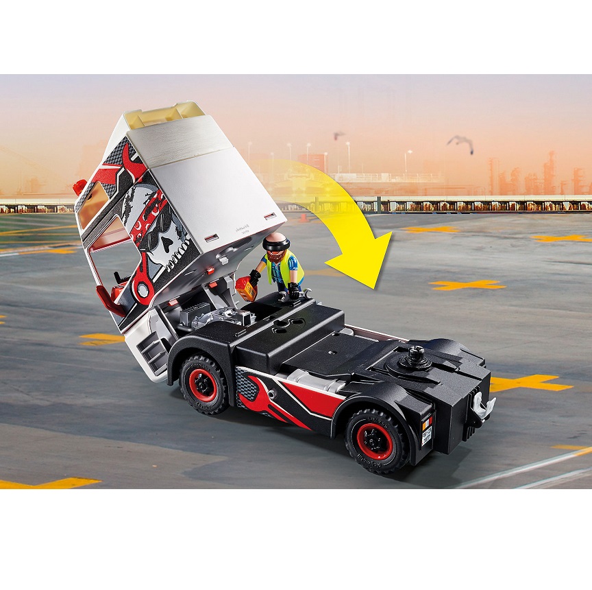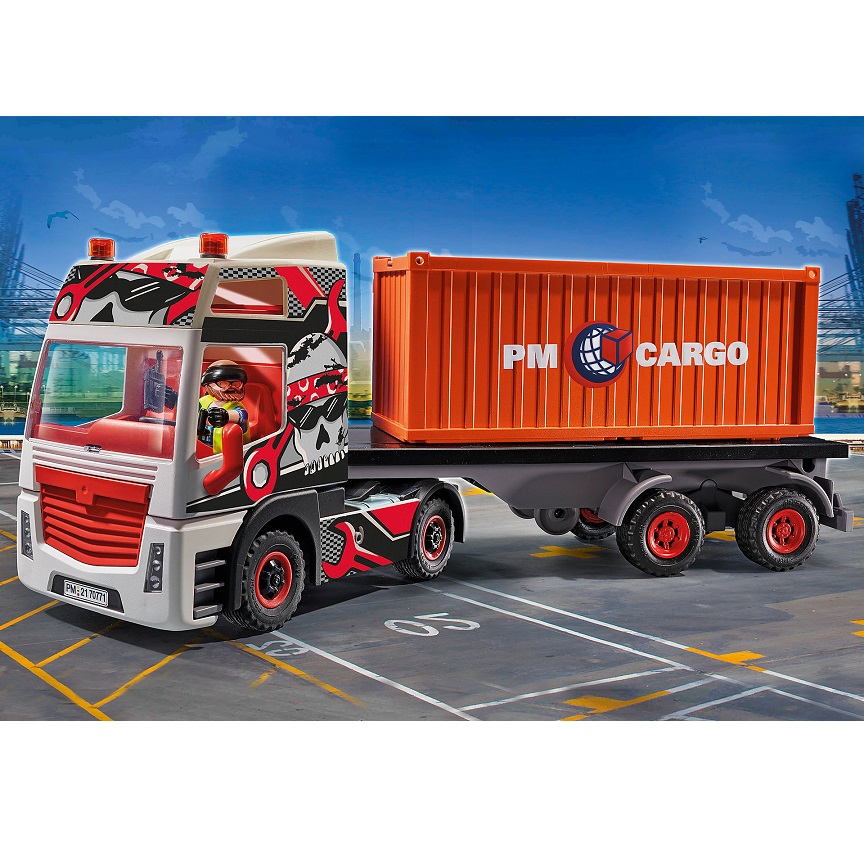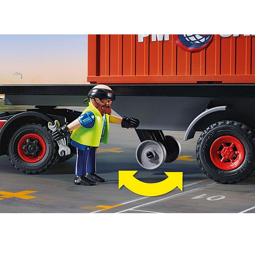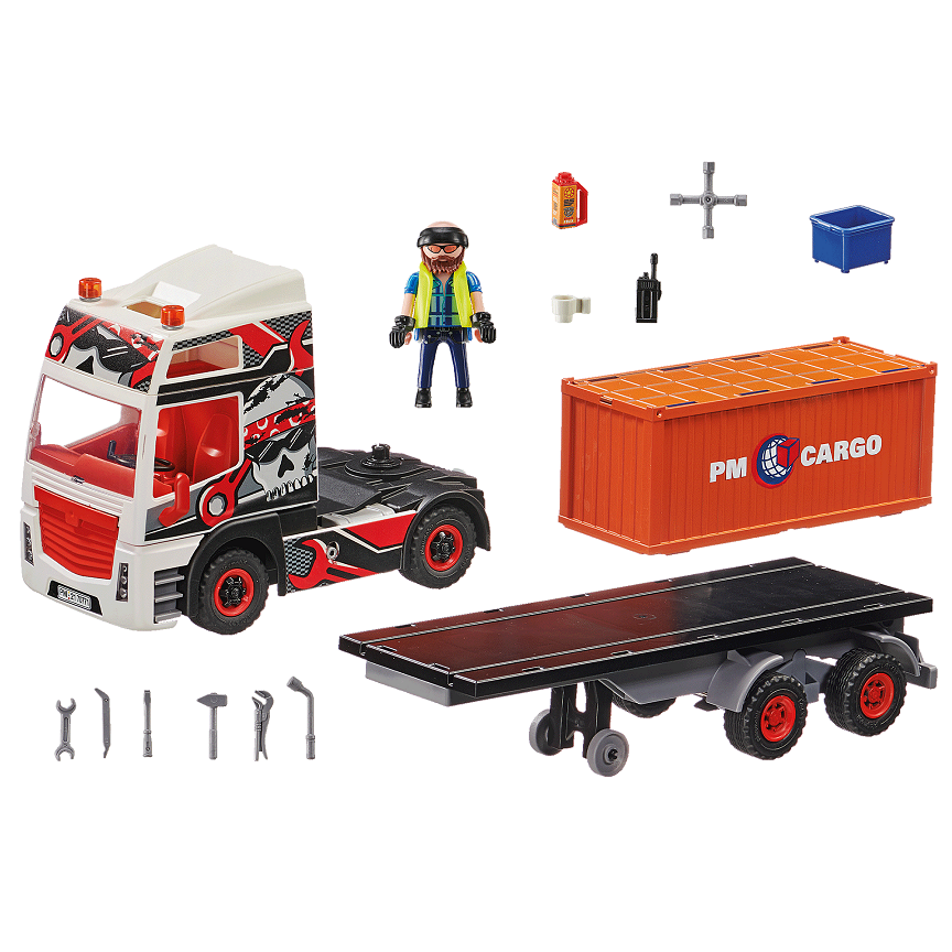 Samochód ciężarowy z przyczepą 70771 służy do transportowania towarów na lądzie. Solidna ciężarówka może być sterowana zdalnie (moduł sprzedawany oddzielnie) i ma fajny motyw czaszki na kabinie kierowcy. Gdy tylko do portu przybędzie kolejny kontenerowiec, kierowca podjeżdża ciężarówką. W mgnieniu oka ważące tony kontenery są ładowane na dużą powierzchnię ładunkową i ich podróż rozpoczyna się na lądzie. Nie ma czasu do stracenia, ponieważ dostawa jest wyczekiwana z niecierpliwością. Zestaw do zabawy składa się z figurki Playmobil, ciężarówki z przyczepą, radia, skrzynki narzędziowej, butelki z olejem i wielu innych dodatków.