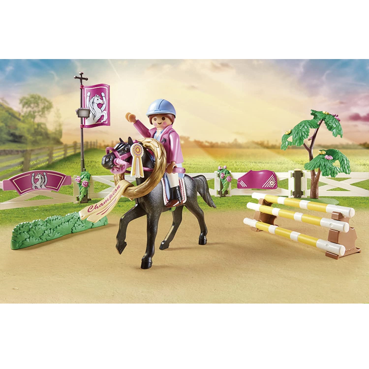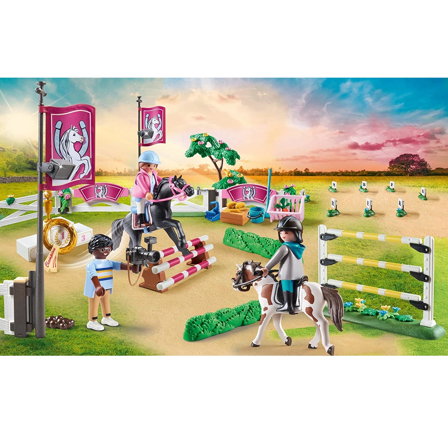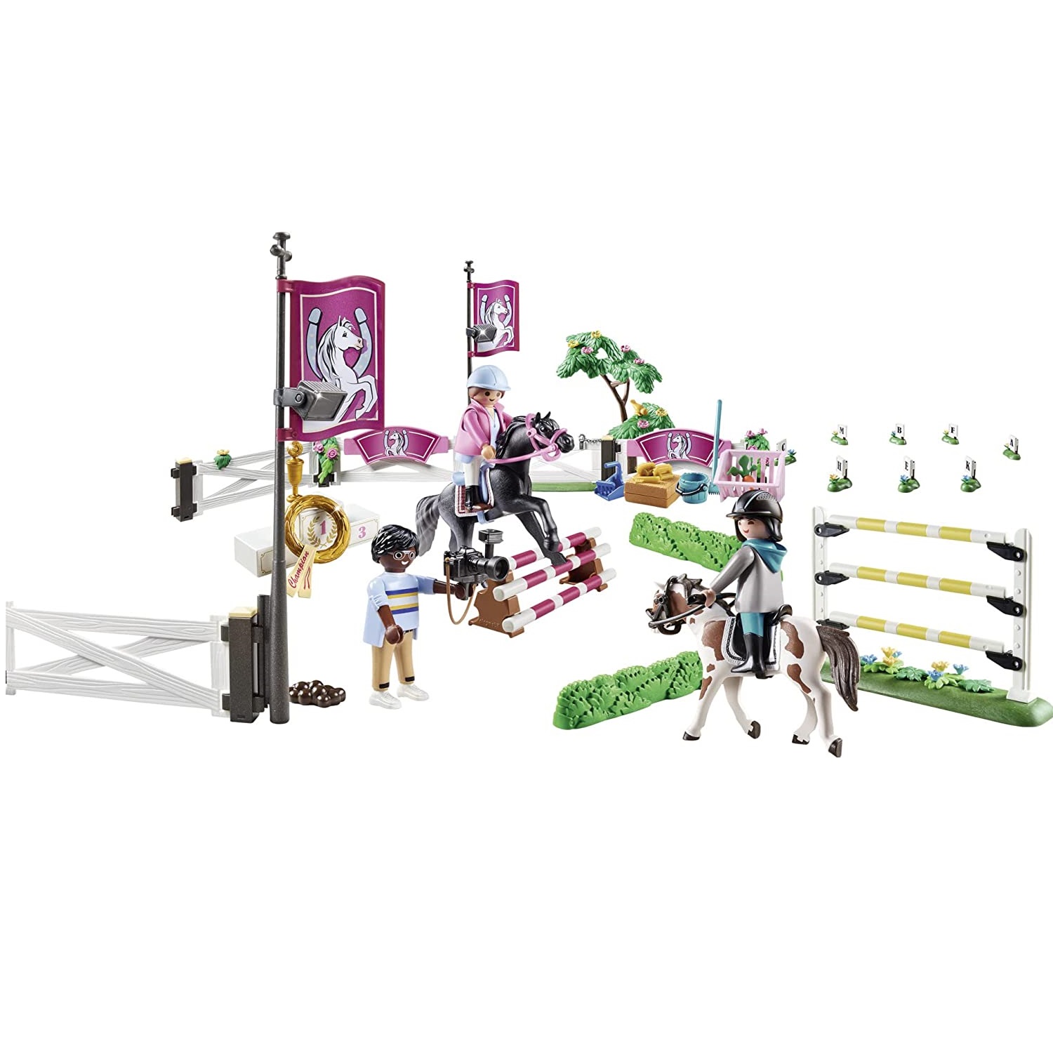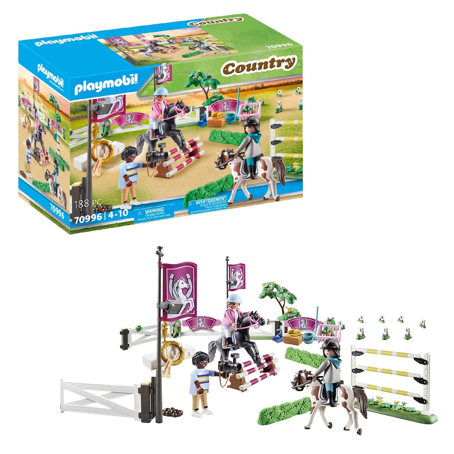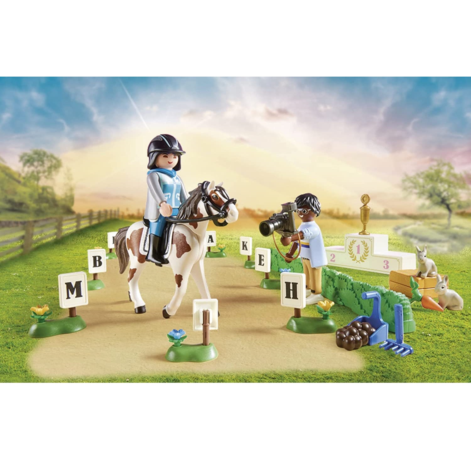 Playmobil Turniej jeździecki 70996. Poznaj najlepszych jeźdźców w mieście podczas turnieju jeździeckiego PLAYMOBIL. Jeźdźcy prezentują swoje umiejętności w różnych dyscyplinach, a na koniec zwycięski koń otrzymuje wielką turniejową wstążkę. Skoki przez przeszkody są dzisiaj w programie. Trasa jest bardzo wymagająca, ale jeździec jest w pełni skoncentrowany i bez wysiłku przeskakuje z koniem każdą przeszkodę. Reporter uchwycił aparatem najpiękniejsze skoki. Co za ekscytujący turniej. Zestaw zawiera trzy figurki PLAYMOBIL, dwa konie, dwa króliki, kantary, elementy ogrodzenia, różne przeszkody, dwie turniejowe baretki, podium zwycięzcy i wiele innych dodatków do ekscytujących pokazów koni. Elementy ogrodzenia można ustawiać indywidualnie. Dołączone znaki literowe można wykorzystać do ustawienia kursu ujeżdżenia.
