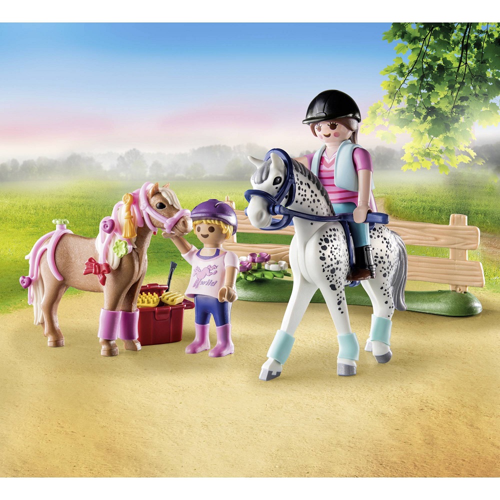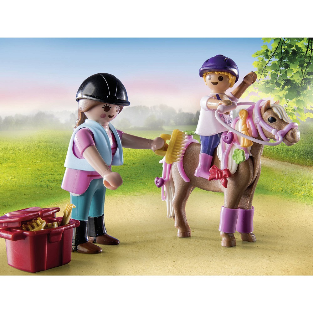 Playmobil Starter Pack Country Pielęgnacja koni 71259. Fani jazdy konnej będą zachwyceni zestawem startowym Pielęgnacja koni firmy Playmobil. Uroczo zaprojektowany zestaw zabawek zawiera wszystko, czego potrzebują miłośnicy koni, aby ich kucyk wyglądał ładnie. Oprócz kokardek i wstążek grzywę i ogon można ozdobić kwiatami i sercami. Następnie obaj jeźdźcy wybierają się na przejażdżkę ze swoimi ulubieńcami.
