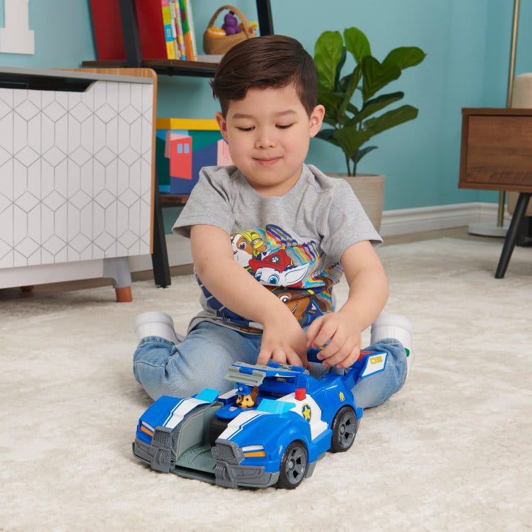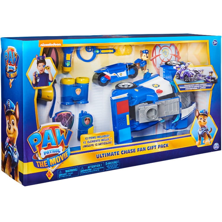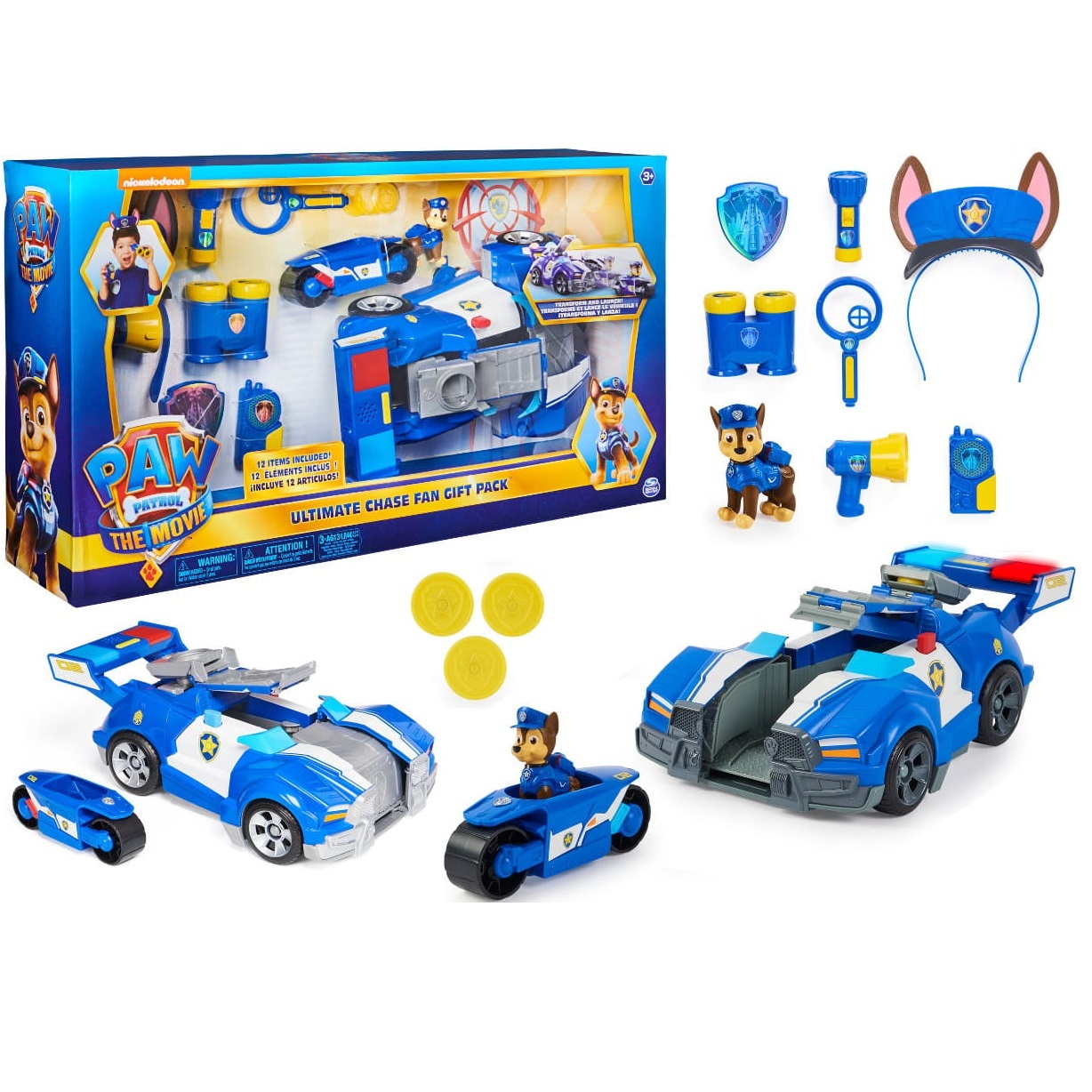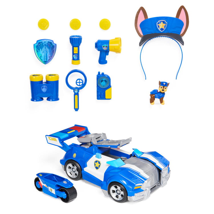 Oto najlepszy zestaw z filmu Psi Patrol! W zestawie prezentowym Chase’a znajdziesz 12 ekscytujących przedmiotów związanych z twoim ulubionym szczeniakiem m.in. pojazd-transformacja z figurą kolekcjonerską i zestawem do odgrywania ról. Policyjny krążownik i motocykl ma wyrzutnie pocisków, migające światła i realistyczne dźwięki. Przełącz go w tryb obronny i chroń Chase’a przed spadającymi odłamkami. Przód się rozszerza, osłona broni Chase’a, a wyrzutnia pocisków wysuwa. Włącz światła i dźwięki, zacznij strzelać dyskami (trzy w zestawie), aby pokonywać przeszkody, a na koniec przełącz się w tryb motocyklowy. Wystarczy, że naciśniesz czerwony przycisk we wnętrzu pojazdu, aby wystrzelić Chase’a i jego motocykl! Możesz także przebrać się za Chase’a! Przymocuj odznakę Psiego Patrolu, wsuń na głowę opaskę z czapką Chase’a. Baw się z pomocą latarki, megafonu, szkła powiększającego i wielu innych zabawek – to doskonałe dodatki do odgrywania ról. Użyj swojej wyobraźni, aby tworzyć również własne misje ratunkowe dzięki zestawowi prezentowemu Chase’a. W środku znajduje się tak dużo elementów, że to doskonały prezent dla wszystkich dzieci. Uratuj miasto dzięki zestawowi podarunkowemu Chase’a!